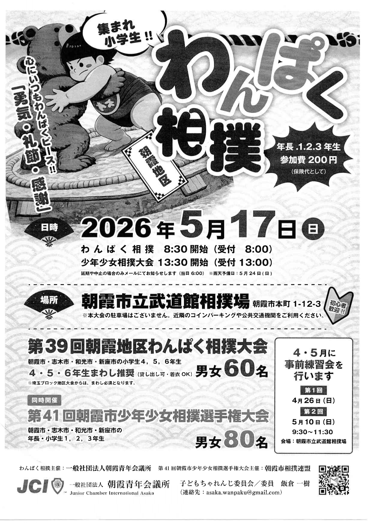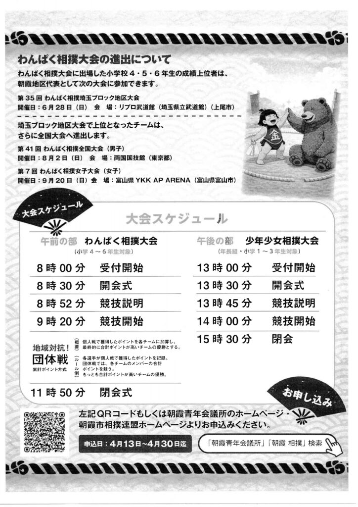 2026年5月17日(日)に開催される、朝霞地区わんぱく相撲大会・少年少女相撲大会の申し込み専用フォームです。参加児童1名につき、1回の申し込みとなります。(兄弟姉妹等で出場をご希望の場合、人数分都度ご入力ください。)各学年の申し込み人数が上限(20名)に達した時点で受付を終了します。他学年からの申し込みは不可とさせて...